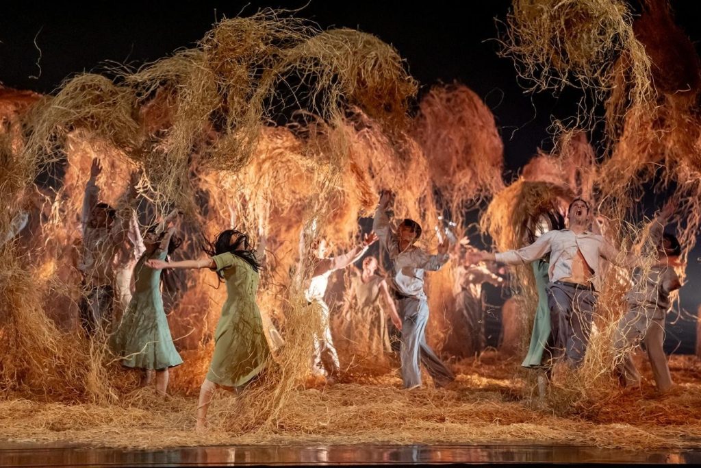 A graceful young woman (the excellent Victoria Jaiani, who will be our main point of romance for the evening) bearing a sheaf of hay, dances down the aisle and up to the stage, waking the young man and then whisking him away through a crack in the curtain, which opens up to a wild, choppy confusion of dozens of dancers thrashing and dashing and flailing across a stage blanketed with golden hay like a vast field at the height of harvest season. From here on, we are far from the forest of Arden, but never far from magic.