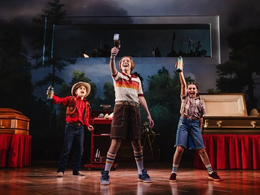 Children bounce and hop before the stage—