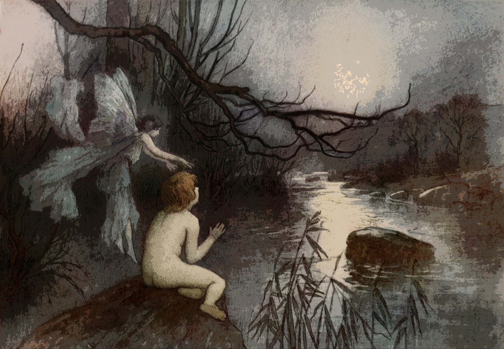 Stylized dreamlike painting of a white winged female fairy touching the brown hair of a naked person. Their back is to us and they're sitting at a dark pond on a misty day. Rocks and tree branches are in the water.