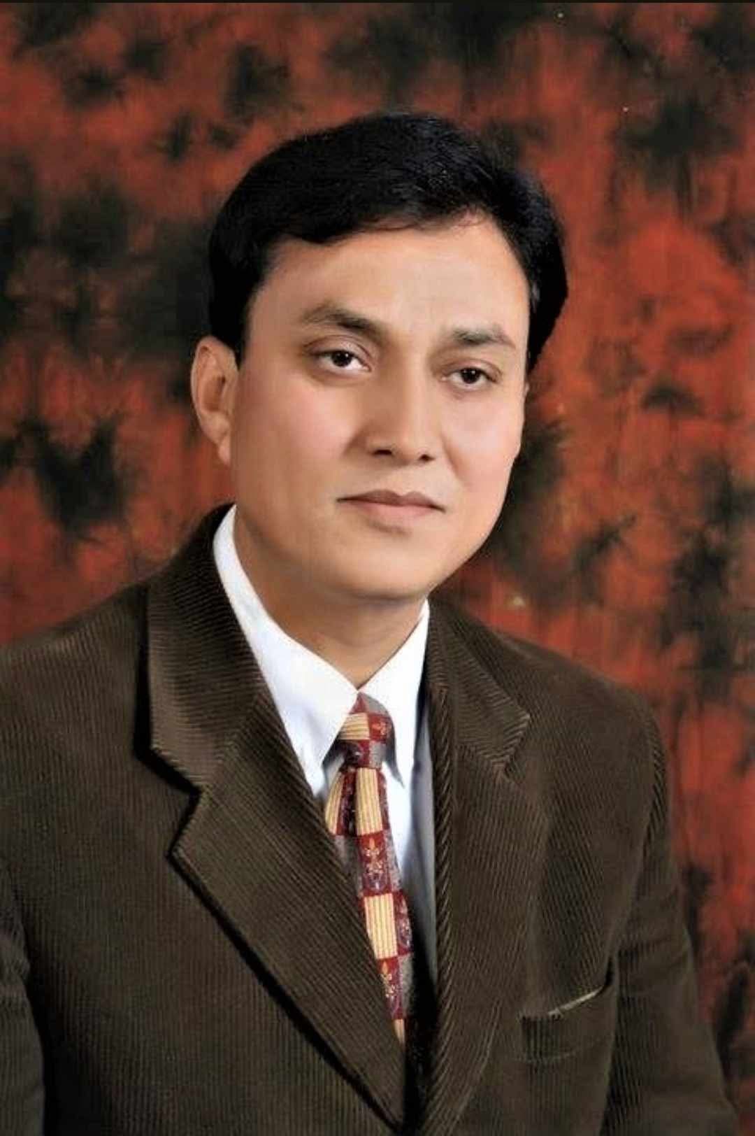 Older East Asian man with short graying dark hair, reading glasses, and a dark coat, seated in front of a computer and curtain.