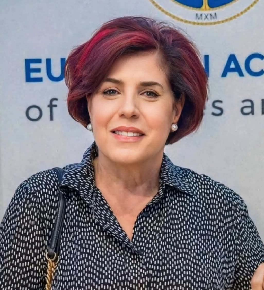 Italian woman with pink highlights in her dark short hair, pearl earrings and a black and white blouse.