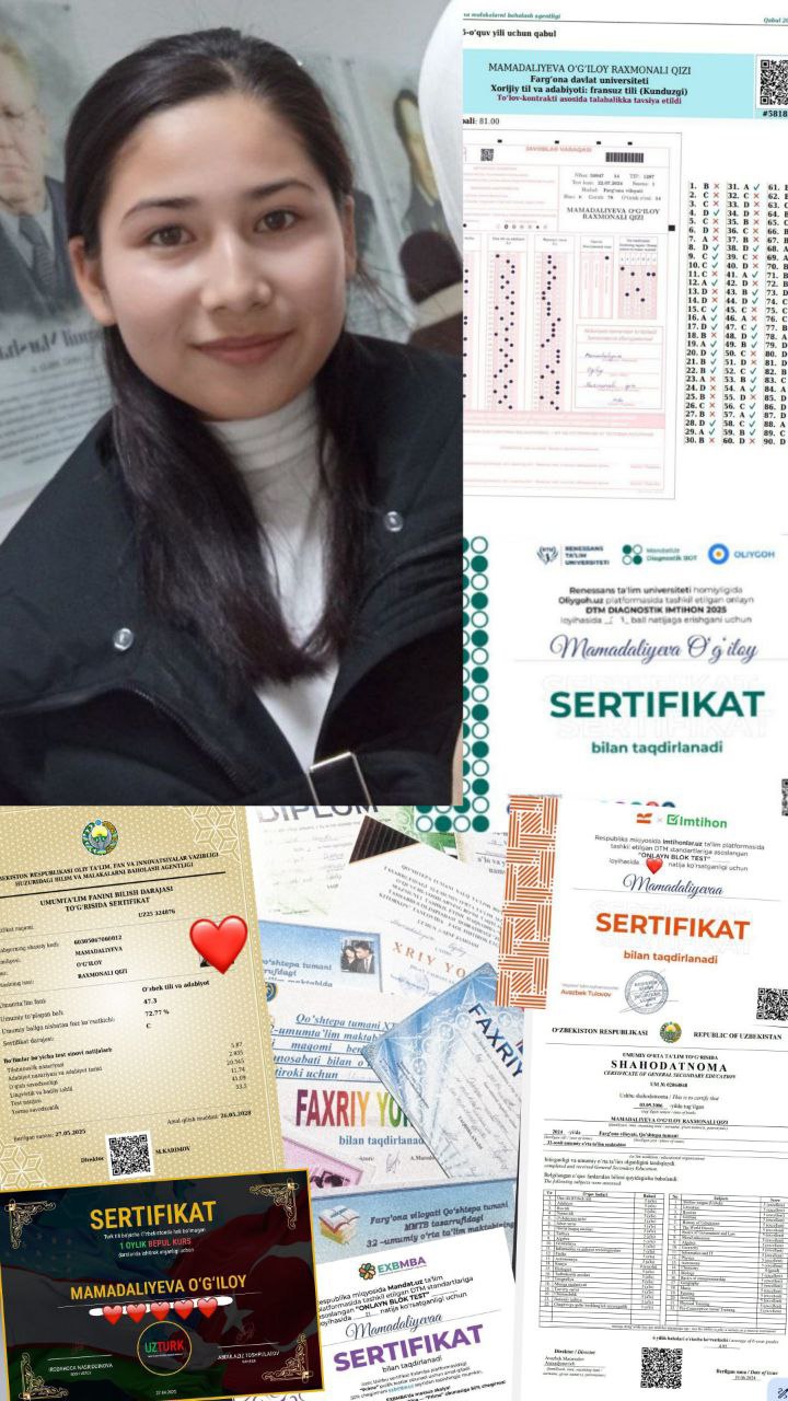 Mamadaliyeva O‘giloy is a first-year student of Group 25.38 in the Primary Education program at the Faculty of Pedagogy, Psychology, and Art Studies of Fergana State University.
