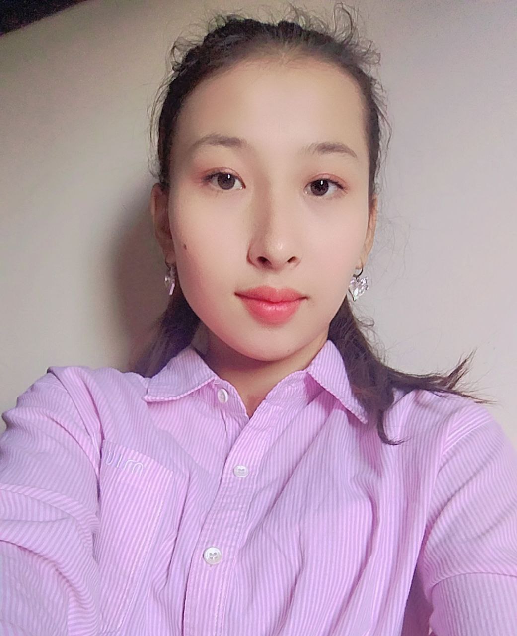 Young Central Asian woman with dark hair in a ponytail, brown eyes and small earrings, and a pink collared shirt.