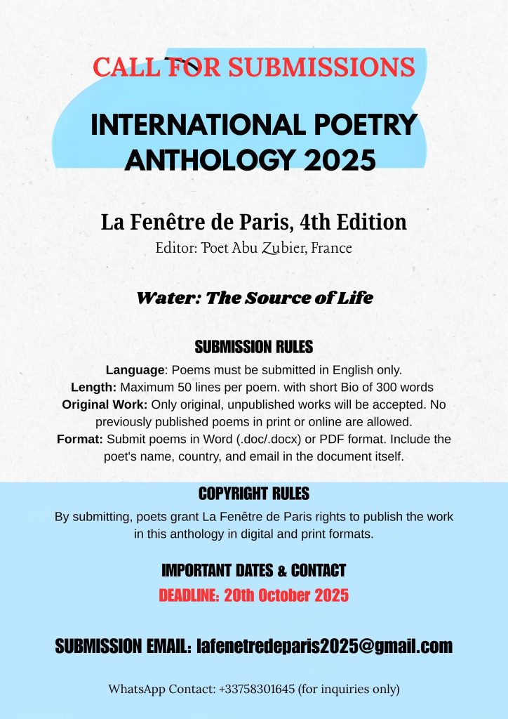Format: Submit poems in Word (.doc/.docx) or PDF format. Include the poet’s name, country, and email in the document itself.