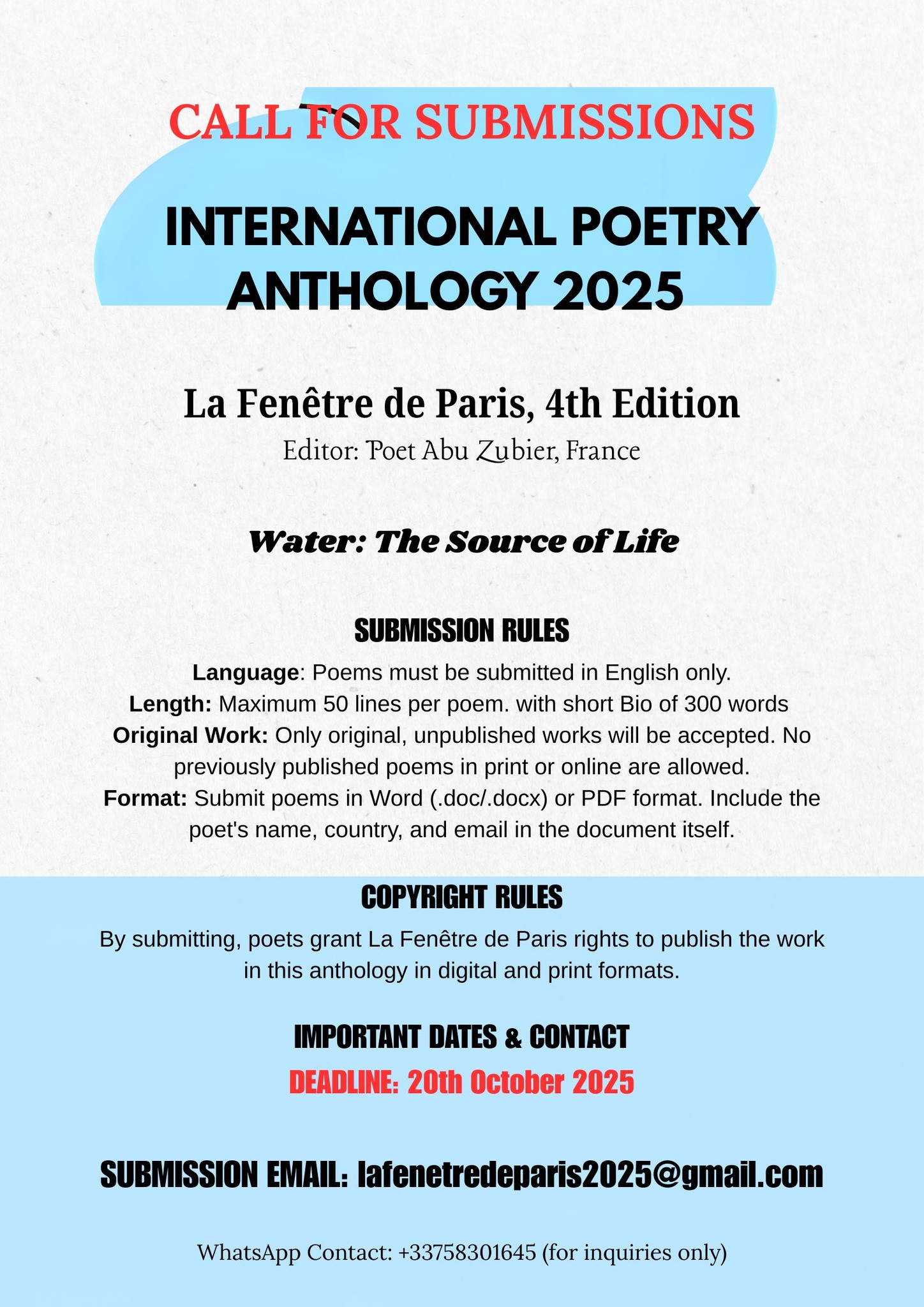 By submitting, poets grant La FenĂȘtre de Paris rights to publish the work in this anthology in digital and print formats.