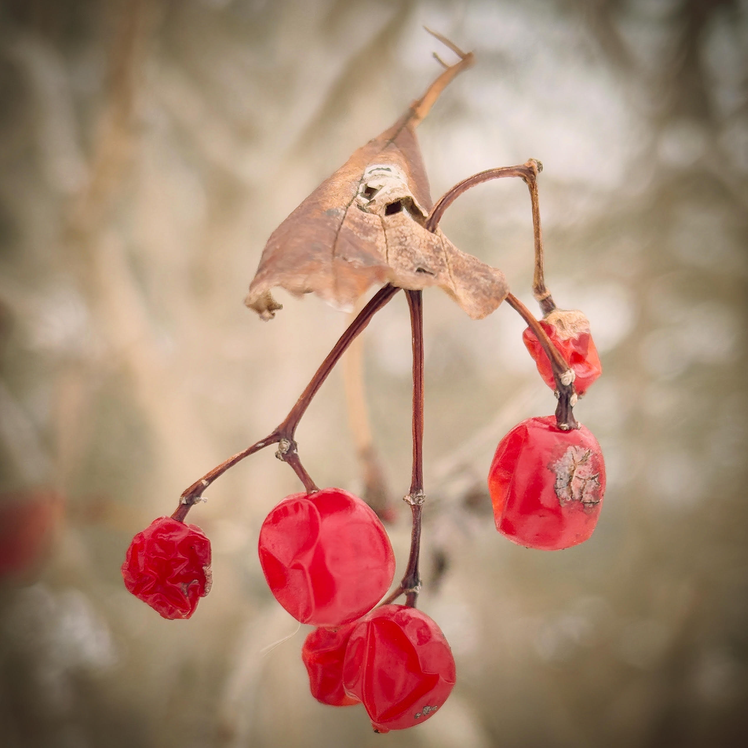 I paused by the invisible angels of evergreens and thought of Rainer Maria Rilke. He had said an angel to a modern would appear terrifying. Maybe that’s why they couldn’t be seen. Breathe. Yes, take a break and even a photograph of the red berries down the way that remained on a tree even in the cold and strange, the overcast and challenging, winter months.